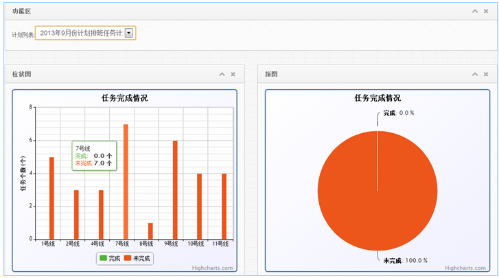 统计每个计划项目下所有线路任务完成情况、两种直观展现方式统计结果、分析统计任务完成时间及未完成原因,方便追踪任务始发周期情况。