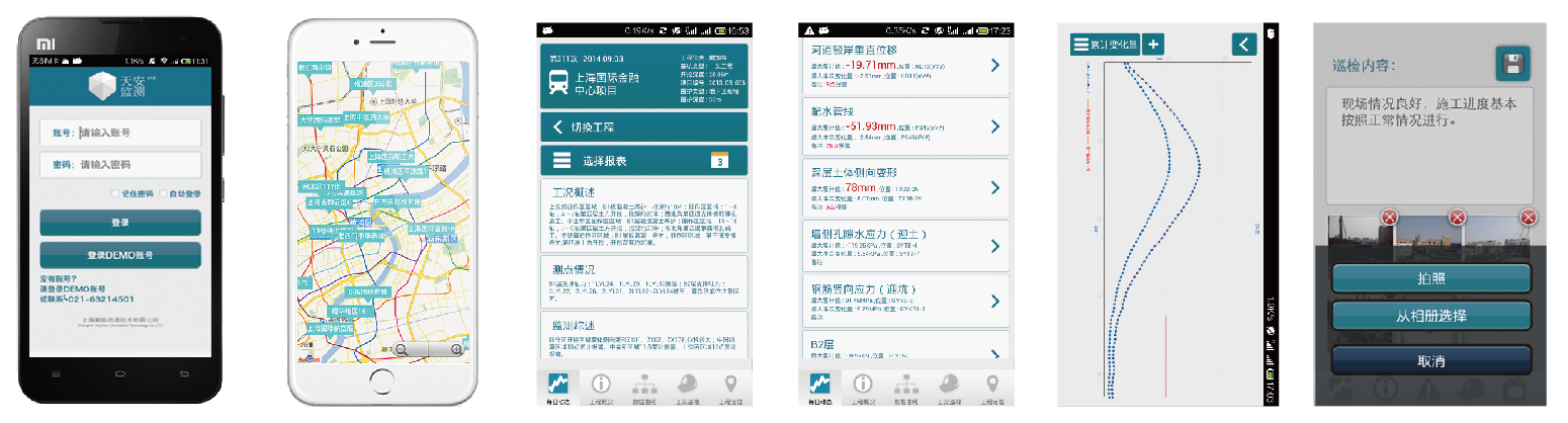 移动监测系统涵盖iOS以及Android两大移动平台,让用户能随时随地关注工程安全状态,提供监测数据报表的查看,由总评表、分项报表、测点曲线的三层查看模式,以及其他工程信息的查看发布平台,方便用户了解工程的项目信息、监测报警、监测数据、监测曲线、现场工况、工程定位等等信息,相关各方可以随时随地通过网络查询自己关心的数据,并通过移动监测内置的通讯录及时和相关各方沟通。系统同时利用智能手机硬件特点,实现了工程地点地图地位。结合移动终端摄像头功能实现现场工况的直接拍照采集现场情况,通过移动网络上传至平台后,可在发布浏览系统中直接浏览查看。