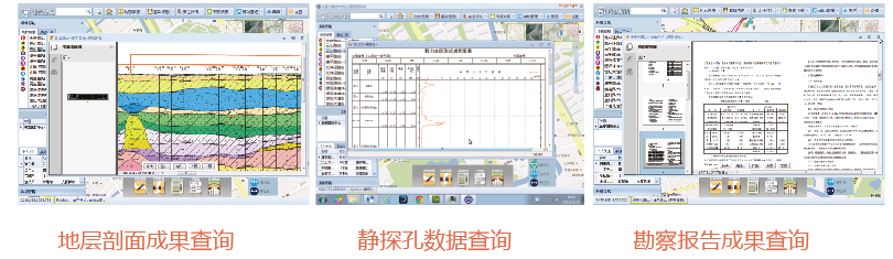 - 钻孔成果图查询:实时查询钻孔柱状图、静力触探曲线等成果资料;